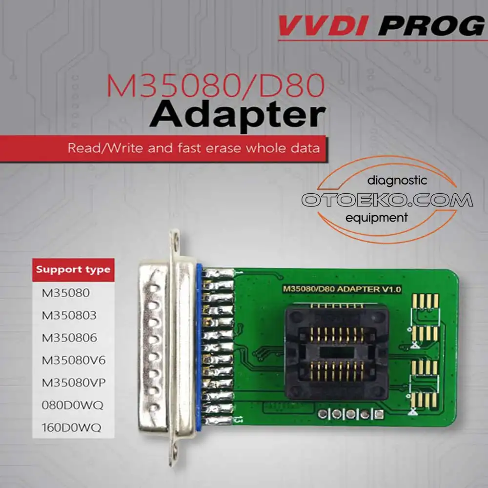 XHorse VVDi Prog M35080 / D80 v1.0 Adaptör, Xhorse VVDi Prog için üretilen bir ecu adaptörüdür. VVDi Prog M35080 Adaptörü, genellikle BMW’lerde kilometre ve diğer bazı araçlarda kullanılan 35160DW EEPROM‘u okumak için kullanılır. Bu adaptör, XHorse VVDi Prog Beyin Programlama Cihazı ile çalışmaktadır. Tüm VVDi Prog cihazları ile uyumludur.